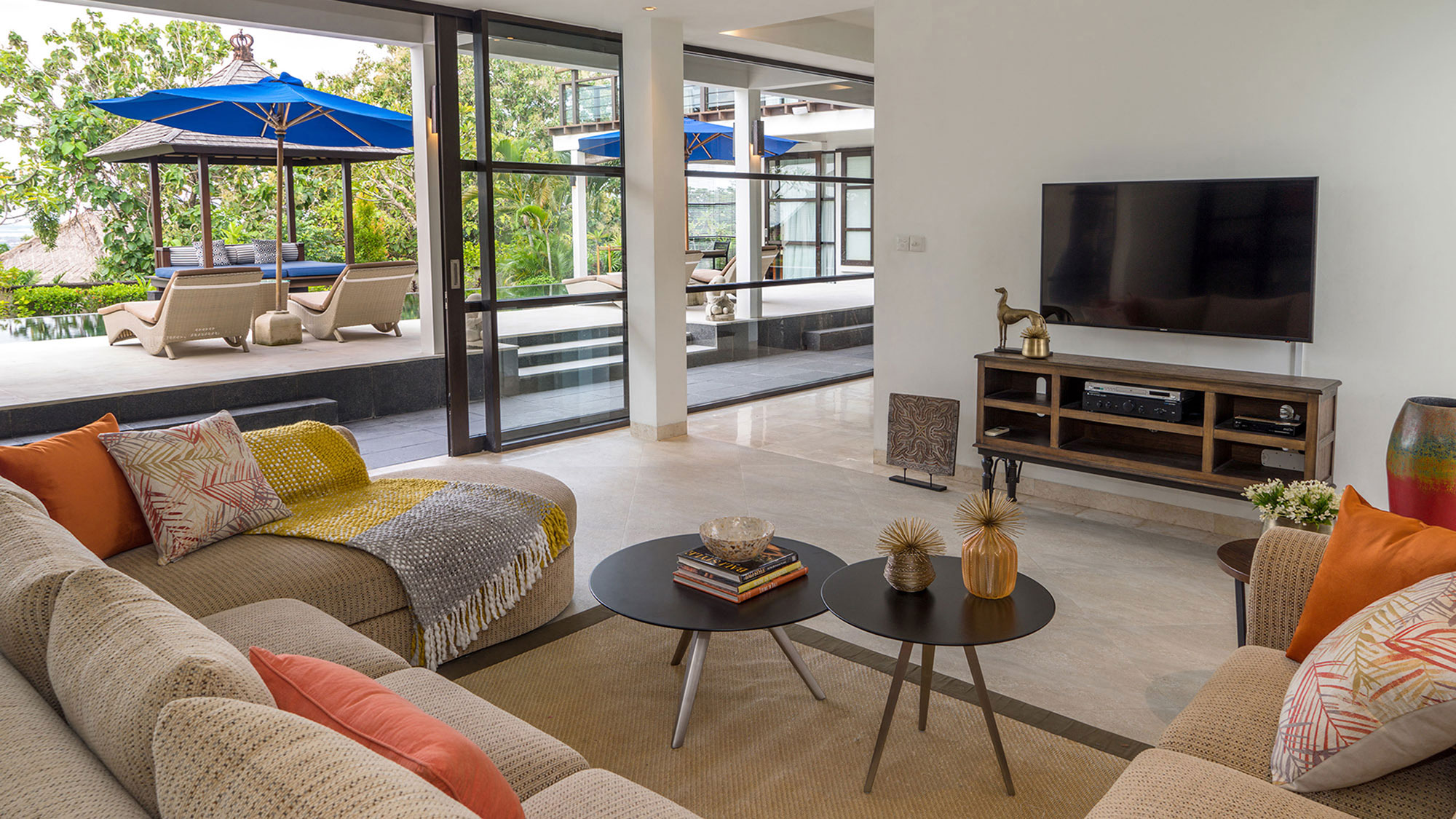 Entering the villa on the middle level, youll find yourself in an expansive air-conditioned living and dining space integrating a sunny breakfast table for 10 positioned adjacent to an immaculate guest kitchen. Hidden out of sight is a professional service kitchen. To the far side of this luxurious space is a formal 12-seater dining table and a guest washroom. The living area is furnished with a large modular sofa, and a 65-inch international-channel TV, while the provision of WiFi and an iPad allows access to music via Spotify, which can be played through ceiling speakers and poolside speakers. At the front of this room, glass doors open to the pool deck, the sea breezes and the view.