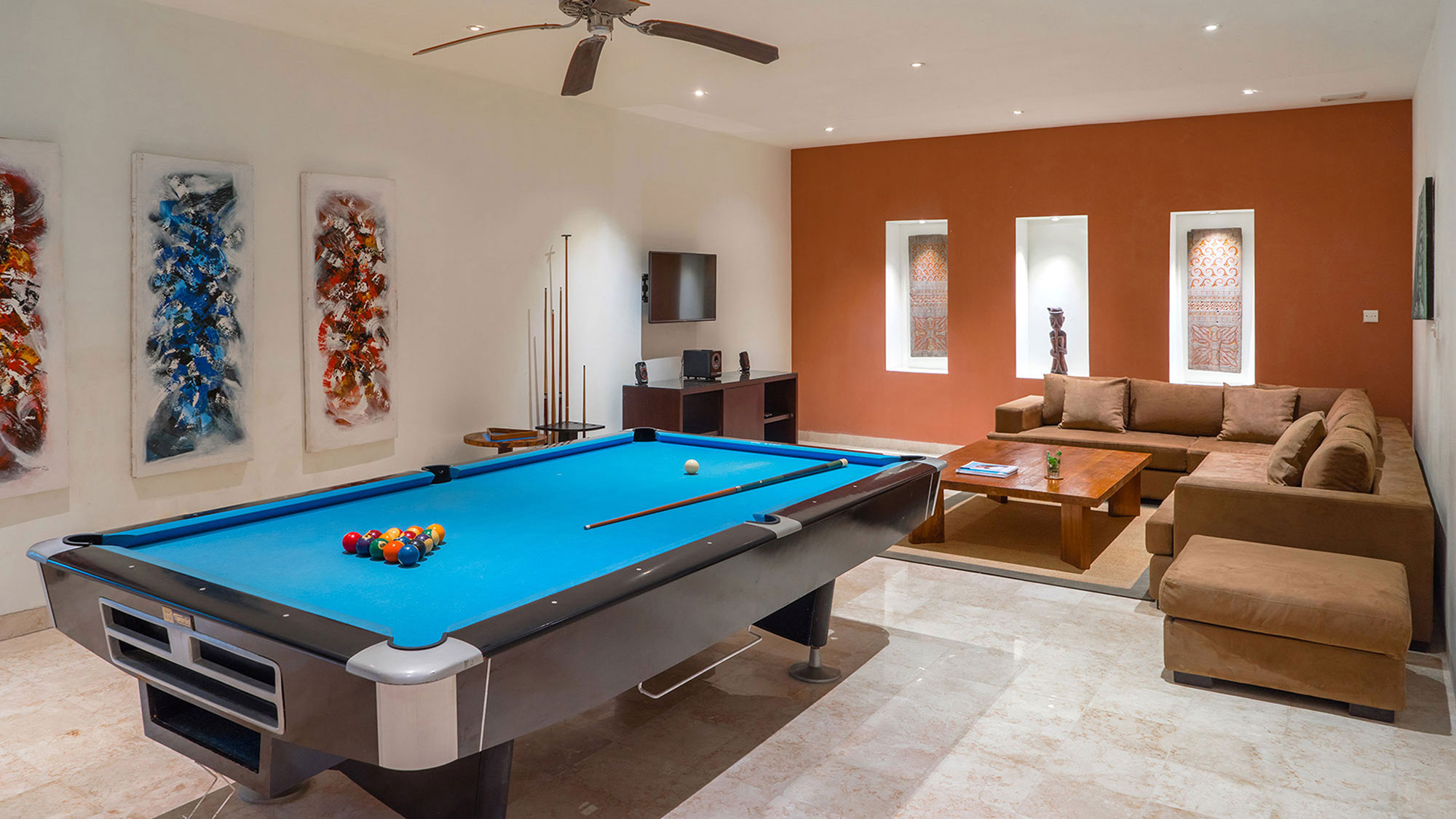 On the lower floor is a games room and bar. To one side is a billiard table and a games table, while to the other is a cosy home theatre, furnished with comfy sofas and chairs and equipped with a 65-inch international-channel TV, a four-speaker surround-sound system, karaoke machine and Playstation 4. Bar tables and chairs extend onto the balcony.