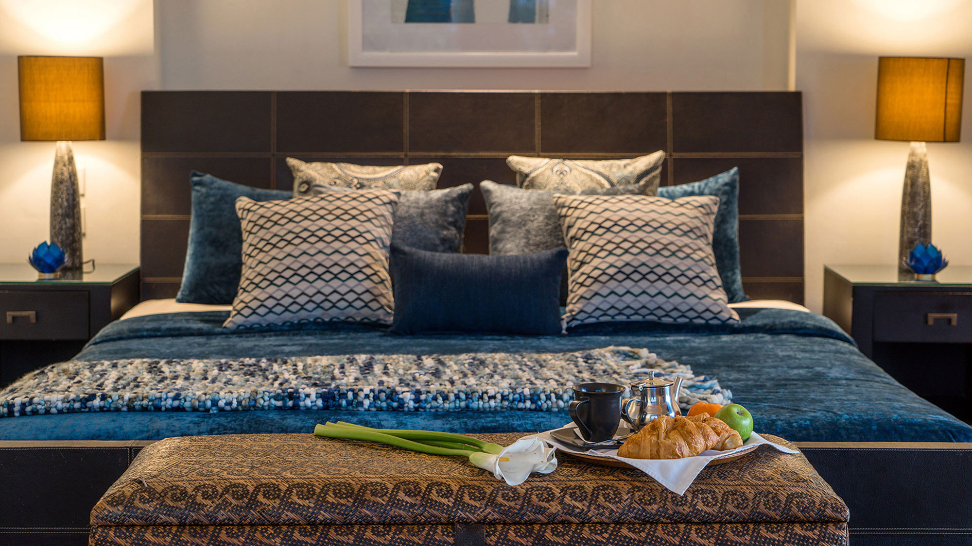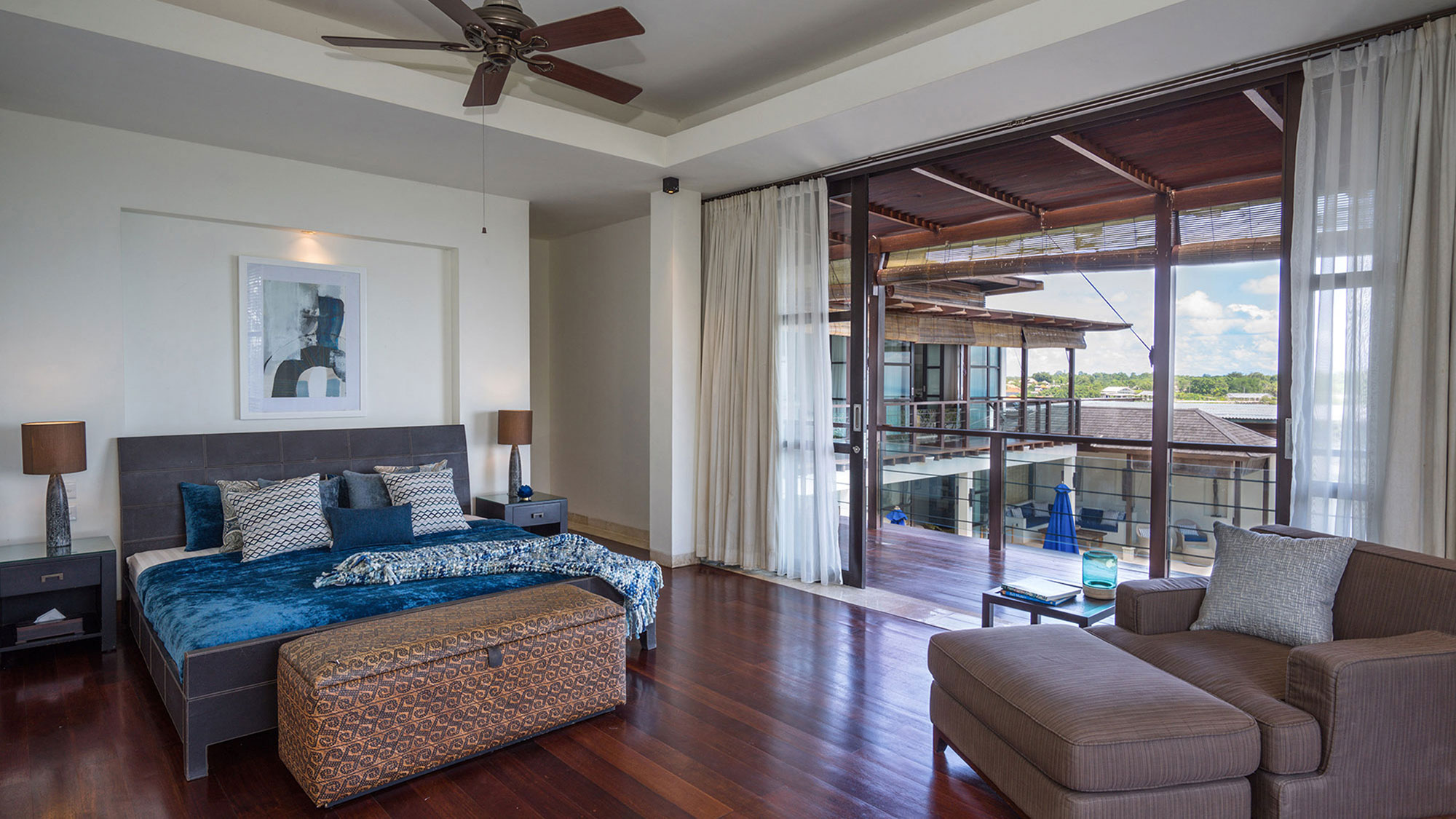 Situated on the middle level, this twin-bedded room opens directly onto the pool deck against a backdrop of the Indian Ocean. The bedroom is adjoined by a dressing area, complete with a built-in wardrobe and an ensuite bathroom fitted with twin washbasins and a rain shower with a handheld option.