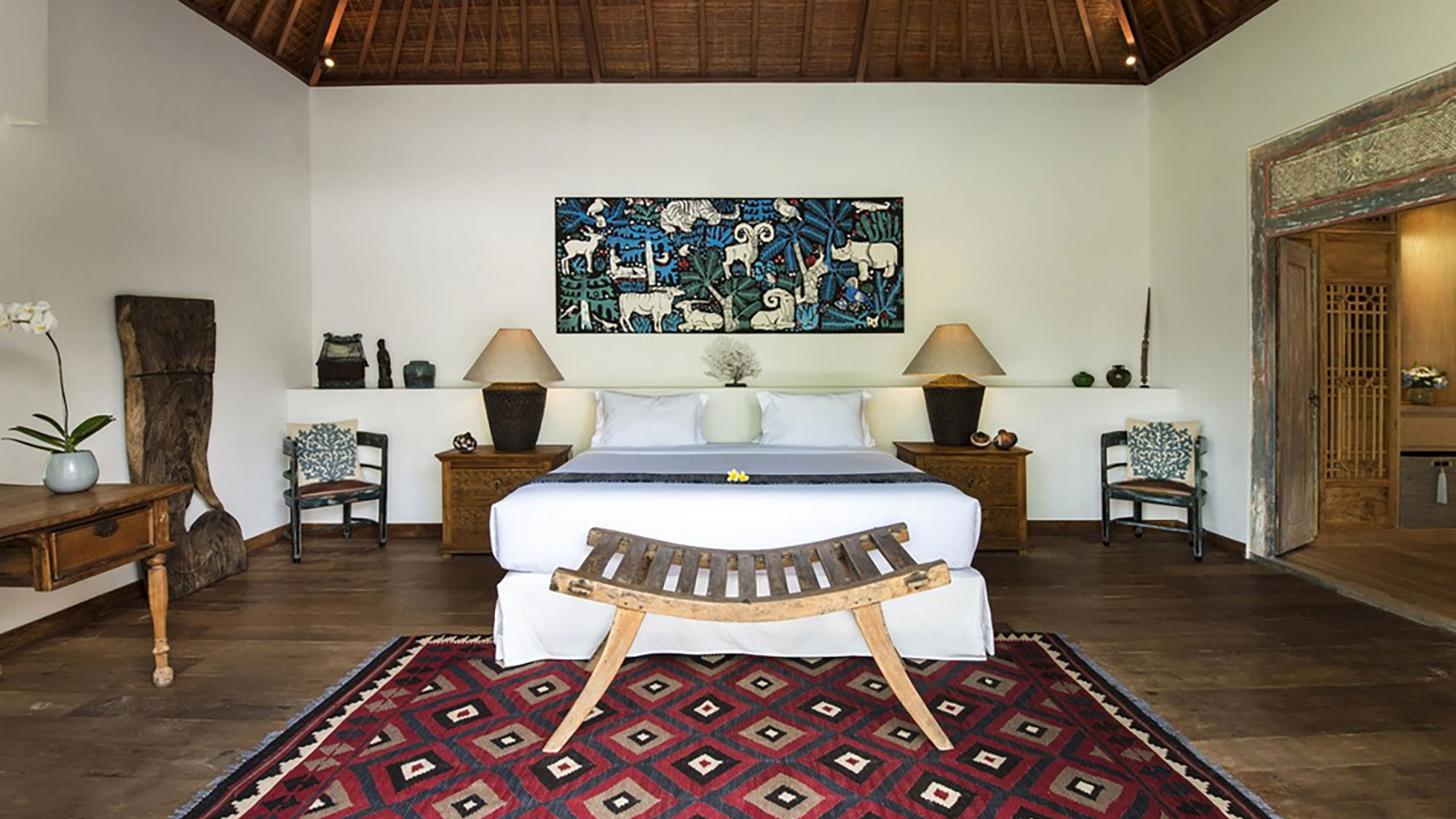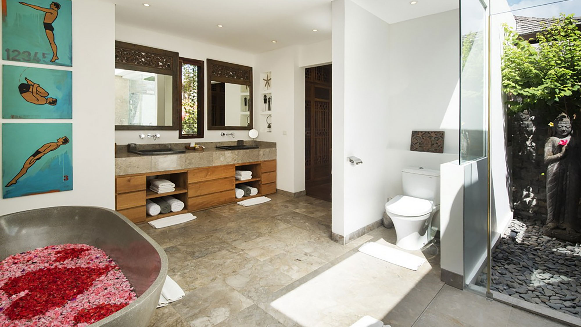 Within the setting of a secluded exotic garden, the villa offers 7 spacious bedrooms in the shape of individual bungalows set around a splendid swimming pool, each of them offering an en-suite dressing and semi-open private bathroom. An eased sophistication exudes from the clever mix of traditional Indonesian elements and modern European aesthetics; the overall atmosphere finds the perfect balance between the relaxing Balinese culture and Western standards of luxury and comfort.