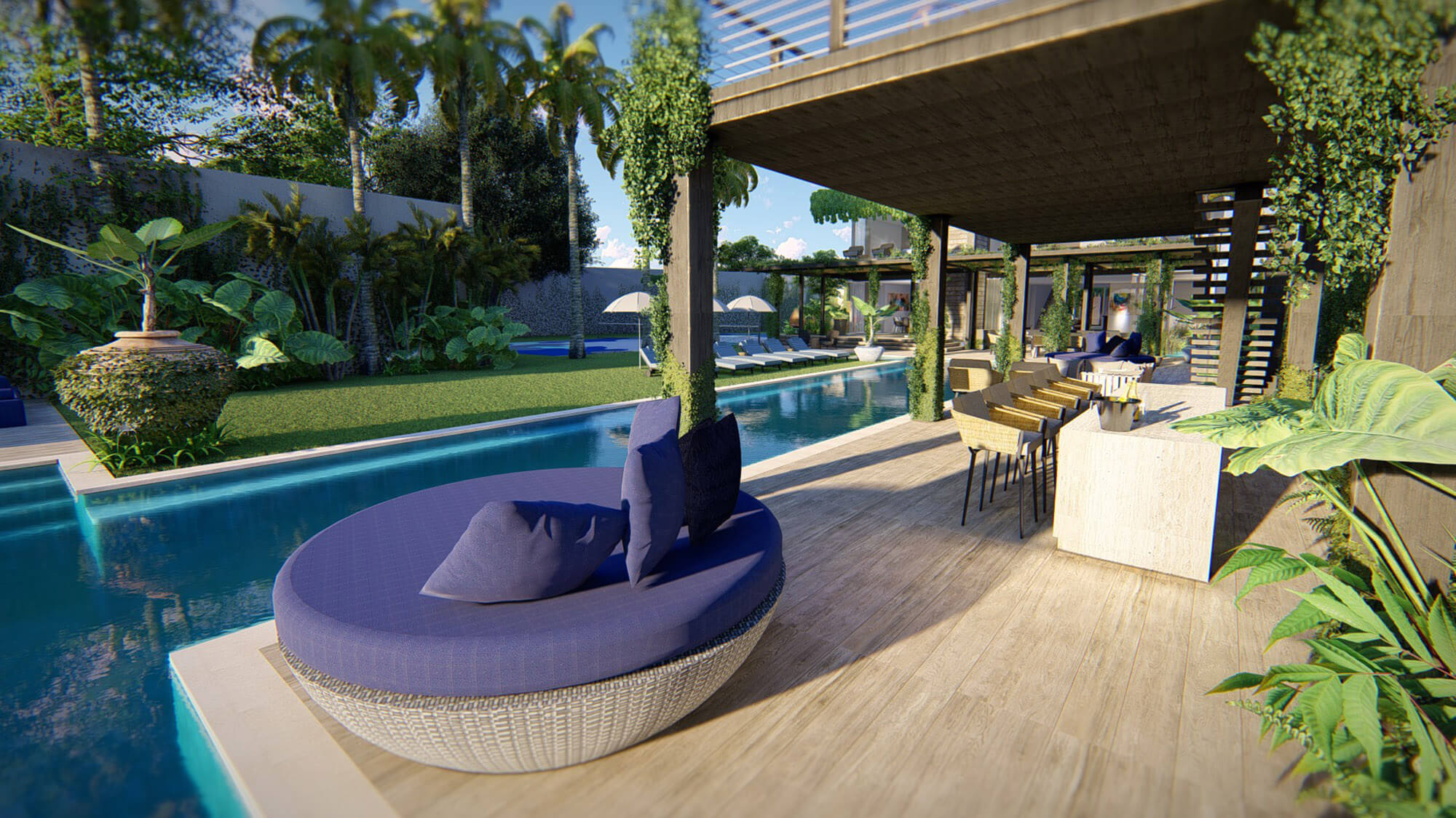 Dining options abound. Choose from an elegant indoor dining area, outdoor dining under a covered terrace, rooftop terraces, and two raised oceanfront decks with long views down the beach to the cliffs of Jimbaran Bay. Perfect for Champagne cocktails at sunset, served by the villas professionally trained staff.
