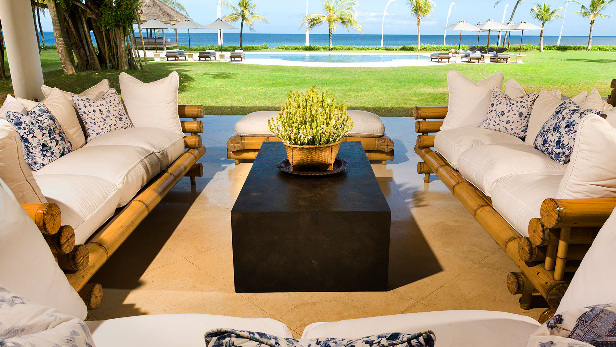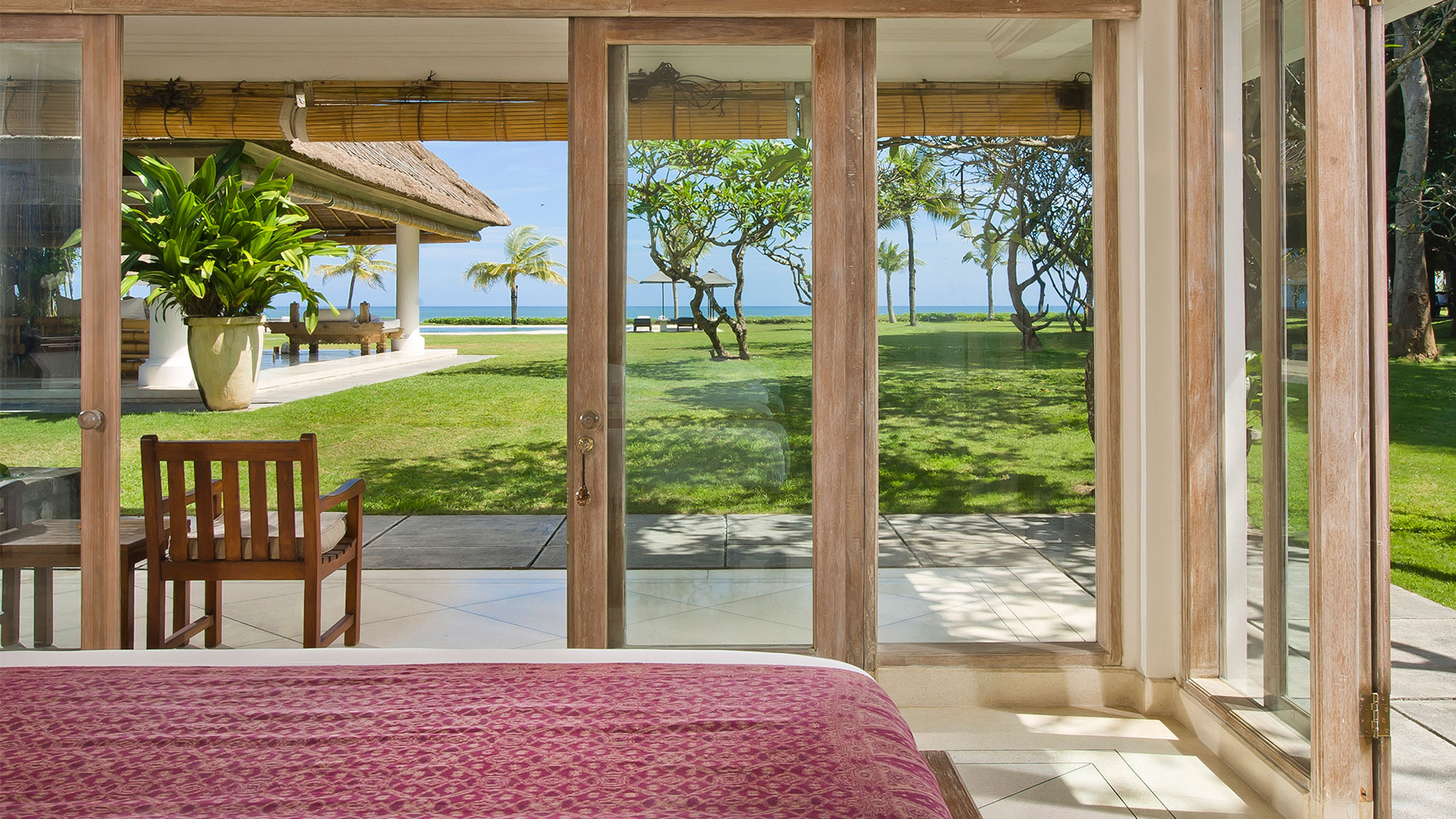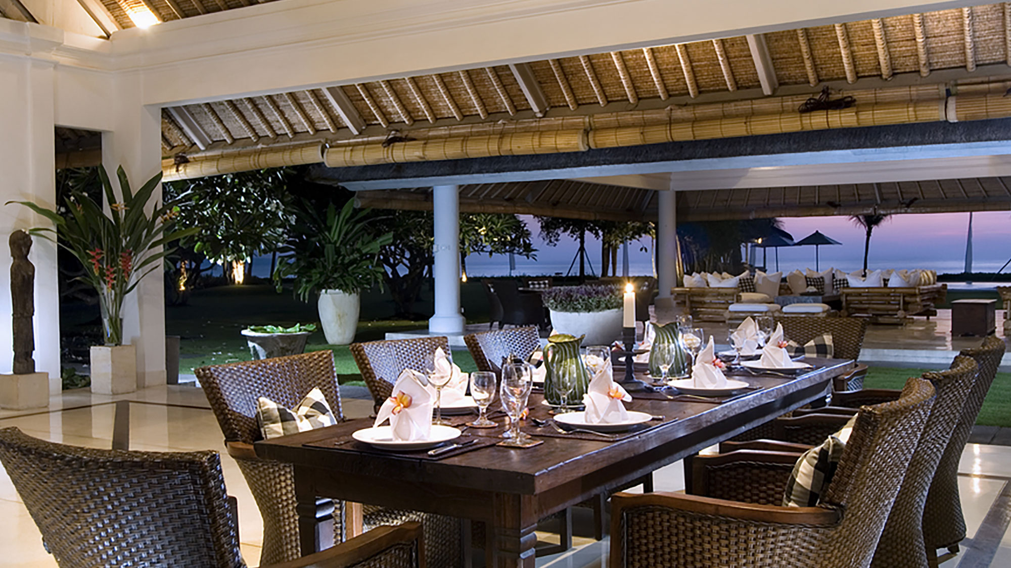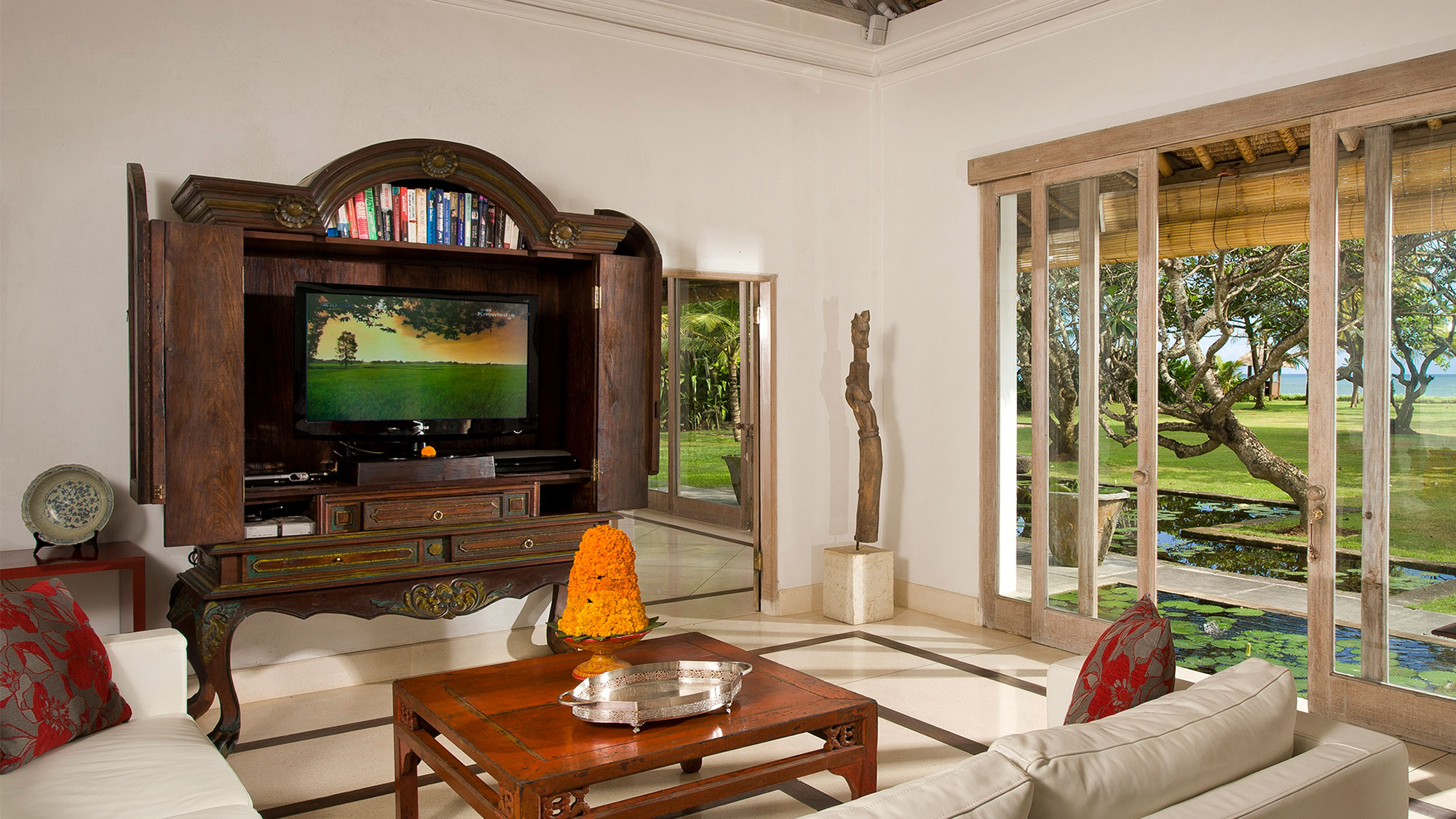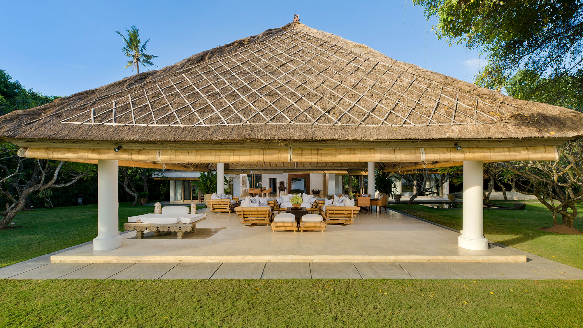 At the heart of this heavenly beachfront estate is the huge open-sided alang-alang thatched living pavilion cooled by the sea breeze and complete with remote control Bose surround-sound system. Even the oversized bamboo sofas are dwarfed in this massive entertainment space, which provides a wonderful dance floor for the many weddings hosted at the villa. A marble-topped dining table with comfy batik-cushioned rattan armchairs encourages social breakfasts and candlelit dinners.